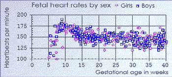 Initially the fetus heart beats at 80-85 beats per minute (bpm), then it increase at about 3.3 beats per day until the ninth week peaking around 155 to 195 bmp. It would then gradually decrease to 120 to 170 bpm over the 40-week pregnancy. The following chart shows the fetus heart rates as a function of gestational age obtained during an experiment.